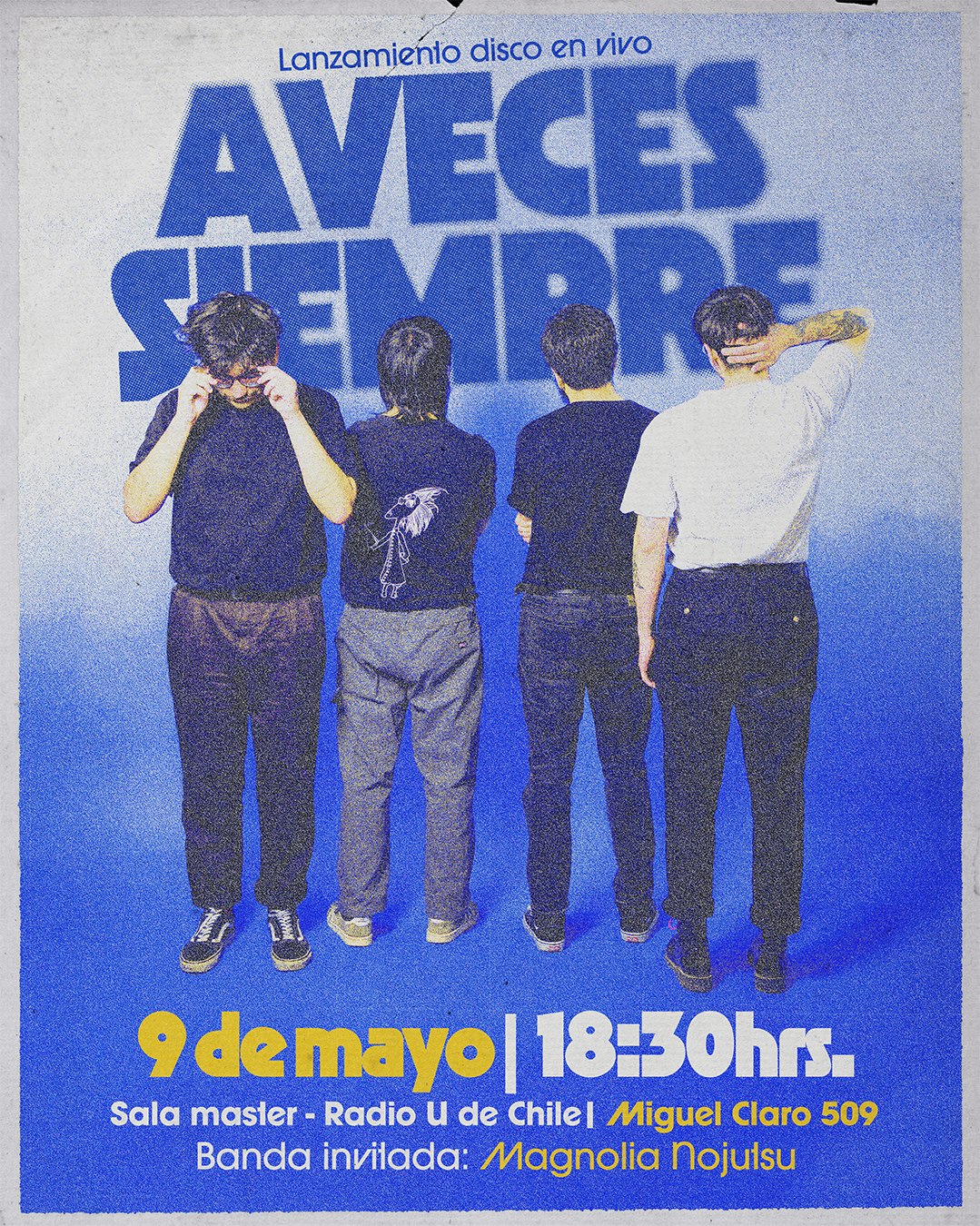 La banda Aveces Siempre se origina en 2025 con Diego, Gerardo, Carlos y Roberto como integrantes. Ellos son un grupo de amigos que convergen desde variados proyectos musicales y que se reunieron a componer canciones tomando como base sonora el pop de guitarras, shoegaze y rock alternativo con influencias británicas y también nacionales. Con varios sencillos bajo el brazo, el cuarteto publicó su álbum debut en octubre del año pasado.