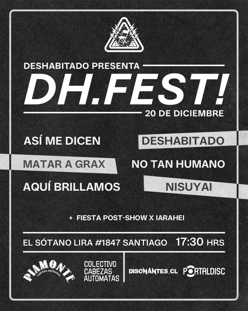 Deshabitado lanza oficialmente su aclamado segundo EP “Dejen Tranquilo el Sector!” en una nueva fecha de DH Fest: un ciclo de música que celebra los nuevos sonidos que sacuden la escena independiente chilena y que en ocasiones anteriores ha contado con la presencia, entre otros, de Hesse Kassel y Los Perros de Pavlov. En esta segunda versión del festival Deshabitado presentará en vivo el set-list que inmortalizó en el gran show de apertura para Molchat Doma el pasado 11 de noviembre. E.E.U.U., Papel y Mensajes de voz son algunas de las canciones con las que la banda nacional encenderá la jornada este sábado 20 de diciembre en Club El Sótano.